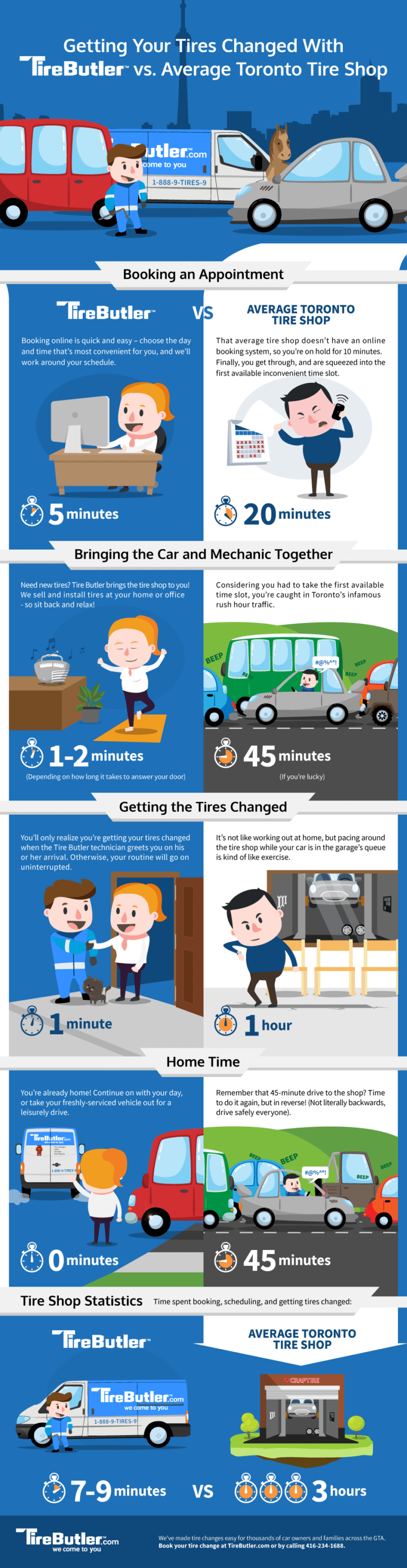 To illustrate our point, compare the typical tire sales & service experience with Tire Butler versus a standard, bring-your-car-in tire shop in Toronto: