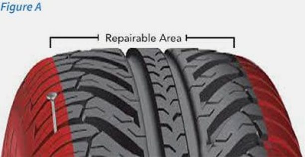 Puncture injury cannot be greater than 1/4-inch (6mm) in diameter. Proper repairs must be performed by removing the tire from the rim/wheel assembly for a complete inspection to assess all damage that may be present. Only punctures that are on the tread area can be repaired. See Figure A.